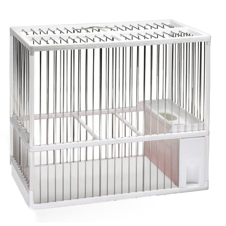 Jaula de concurso C-2 para jilgueros en hierro galvanizado. Mejora la acústica del canto y facilita el transporte a concursos. Incluye comedero interior, puerta guillotina y bandeja plana extraíble. Ideal para criadores y competidores.