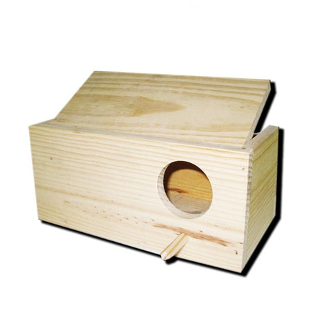 Nido de madera para periquitos con abertura superior y posadero. Ideal para fomentar la cría en un ambiente seguro y natural. Fabricado artesanalmente, este refugio cómodo proporciona privacidad, estimula el instinto de anidación y se adapta a todo tipo de jaulas.