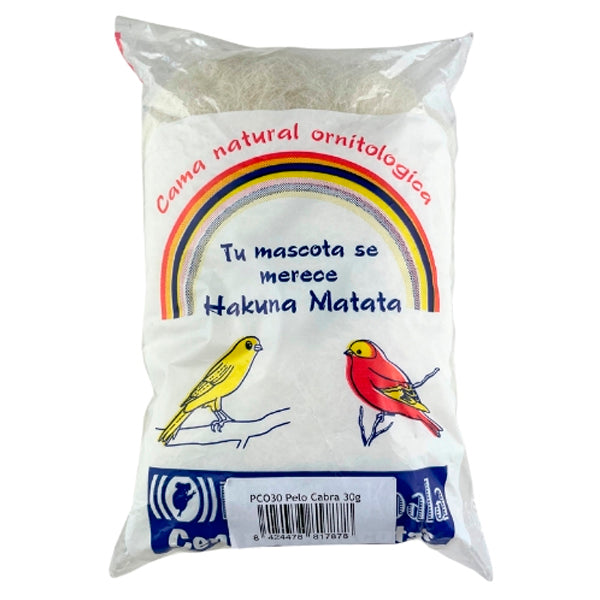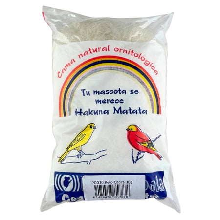 Envase de 30 g de pelo de cabra de textura fina y homogénea, ideal para aves ornamentales en época reproductiva.