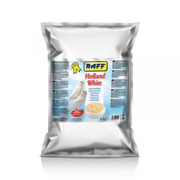 Raff Holland White es la elección perfecta para criadores que buscan una pasta blanca sin pigmentos, con una fórmula altamente digestible, rica en nutrientes y diseñada para preservar la pureza del color natural de las aves.