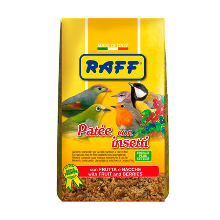 Raff Patee con Insetti es una pasta húmeda con insectos, fruta y gambitas, ideal para pájaros insectívoros y silvestres. Aporta proteínas y energía durante la cría. Formato 400g.